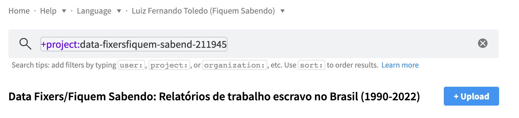 A ferramenta permite pesquisar por palavras-chave dentro dos documentos, destacar palavras e até compartilhar um PDF em uma página específica, o que é ótimo para checagens. Para que a ferramenta de busca funcione é preciso manter a tag "+project:trab-escravo-no-brasil—-211945" e escrever o texto da busca desejada no campo do lado direito.
