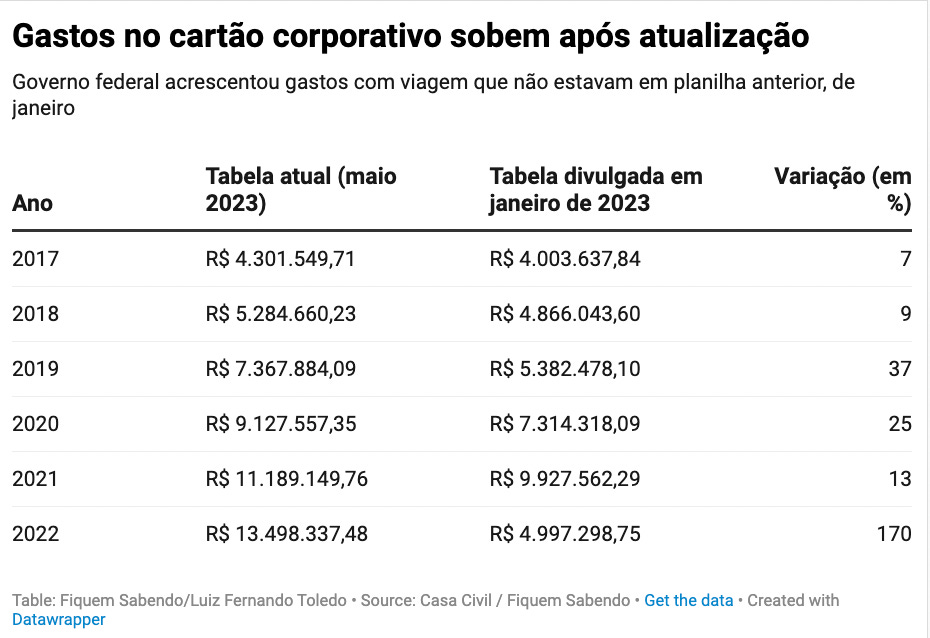 É importante lembrar que existem diferenças entre esta planilha divulgada pela Casa Civil, que têm como base a data do pagamento, e os dados que estão no Portal da Transparência, que consideram a fatura do cartão que é cobrada no mês seguinte (portanto com um mês de atraso). Mais detalhes sobre as diferenças podem ser lidos no cabeçalho da planilha.