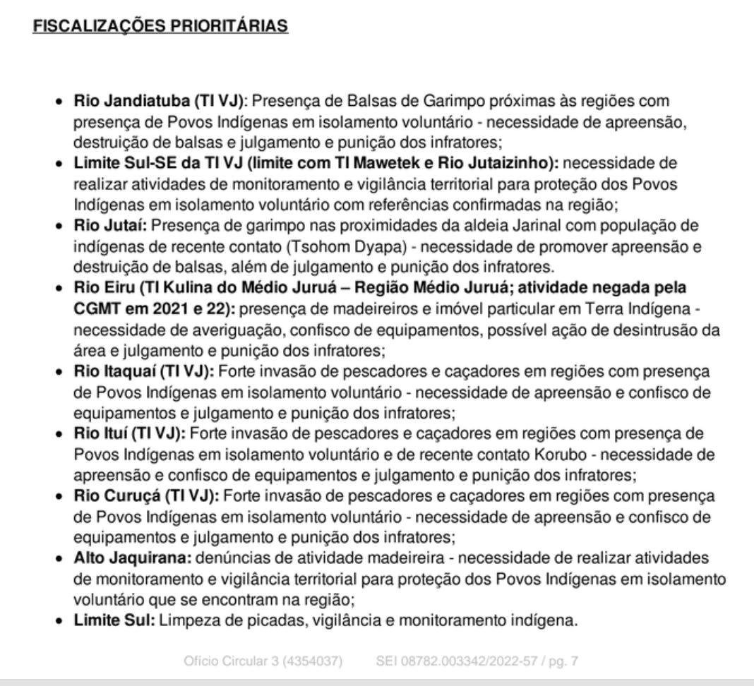 Um ofício da Fundação Nacional do Índio (Funai) mostra que o órgão identificou ao menos nove pontos de atenção para fiscalizar possíveis crimes ambientais em áreas com presença de povos indígenas no Vale do Javari, após os assassinatos. No Rio Eiru e em Alto Jaquirana, por exemplo, identificaram a presença de madeireiros em um imóvel particular em terra indígena.
