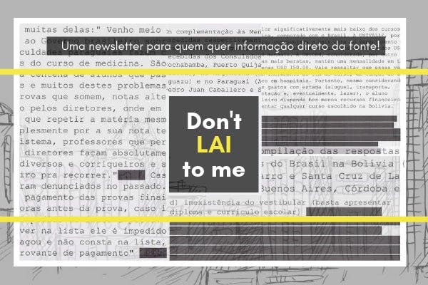 Está é a edição # 10 da newsletter Don’t LAI to Me, a primeira no Brasil a trazer dicas e tutoriais exclusivos de como obter documentos e informações públicas dos governos por meio da Lei de Acesso à Informação (LAI). Este produto é totalmente gratuito e feito por voluntários. Apoie nosso trabalho!