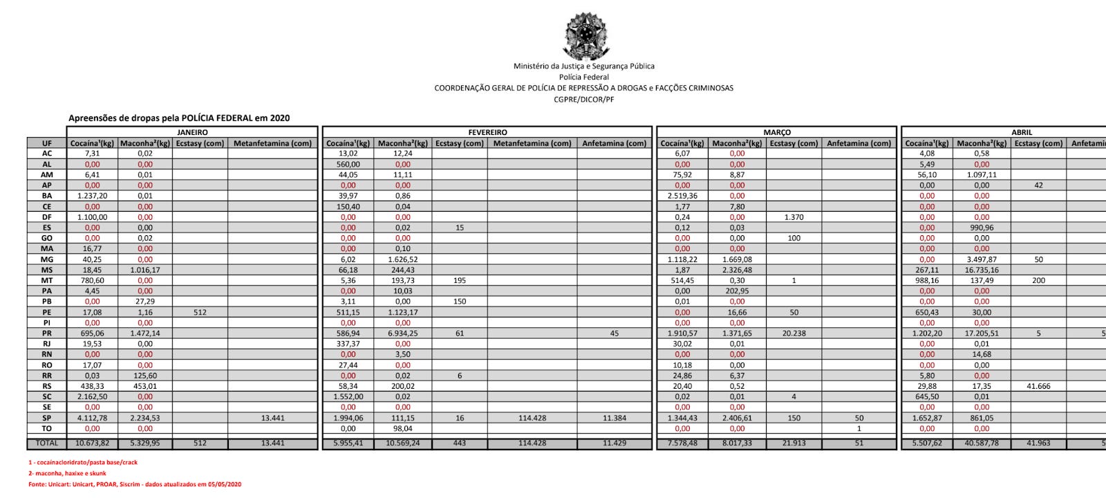 Em outro documento enviado, os dados detalhados por droga são abertos pela corporação, com detalhamento por região do país.