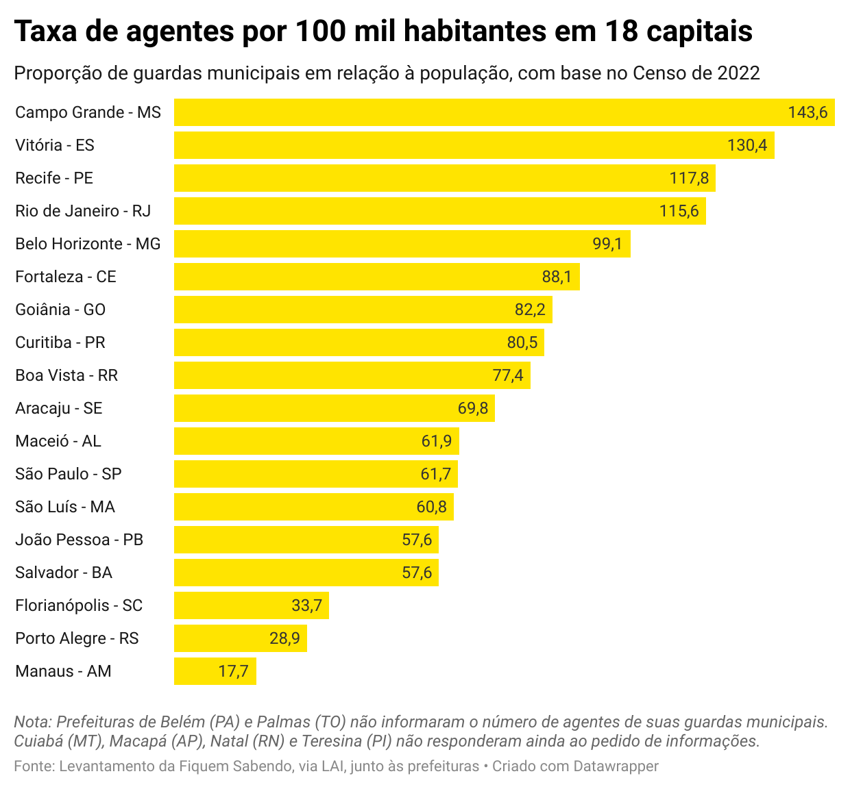 Para obter mais informações sobre a estrutura atual das guardas municipais (também chamadas de guardas civis ou metropolitanas), a FS fez pedidos de acesso à informação às 26 capitais ainda em abril.