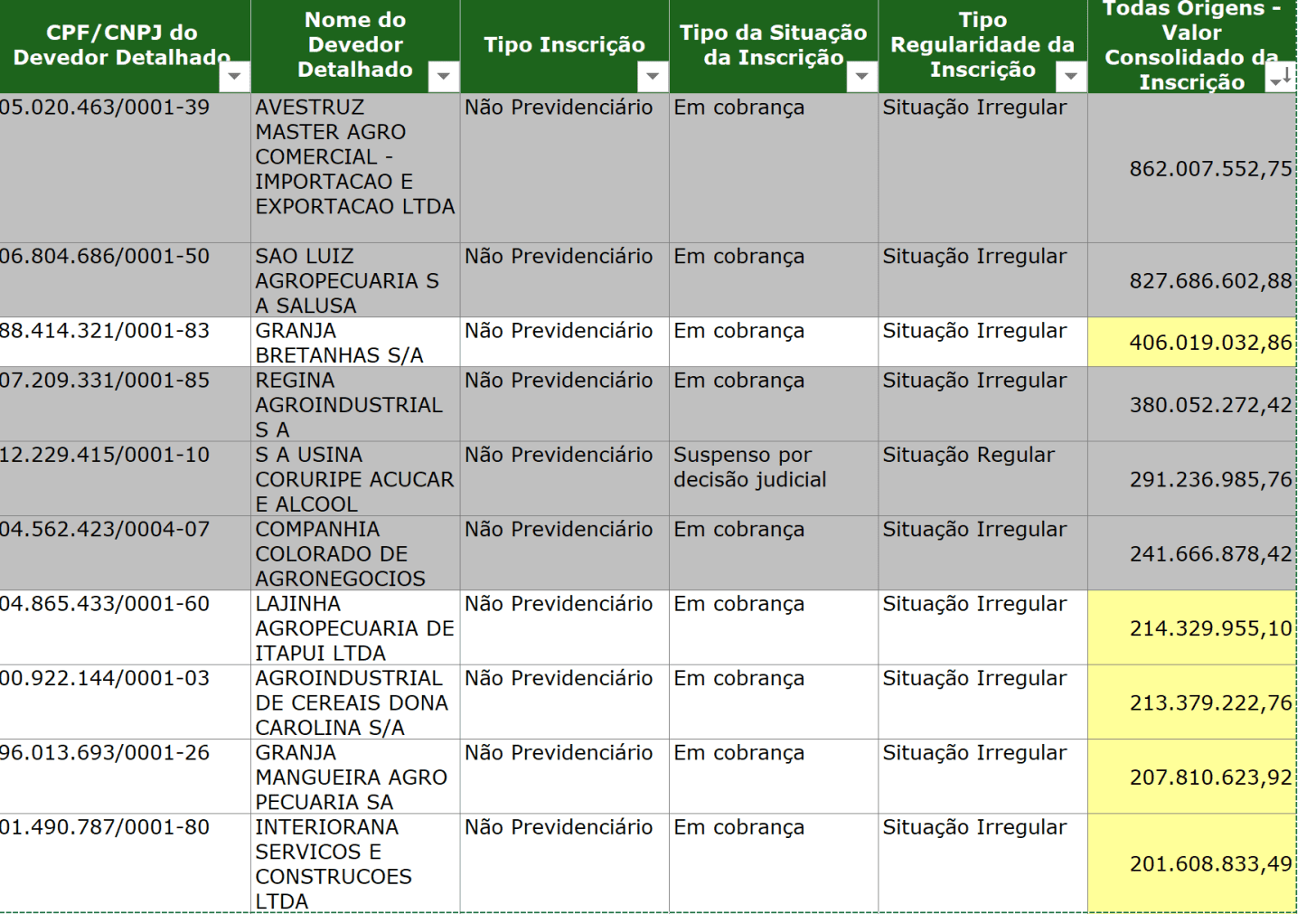 Para um mesmo CNPJ/CPF, ao somar os débitos em situação regular com os débitos em situação irregular, obtém-se o valor total da dívida.