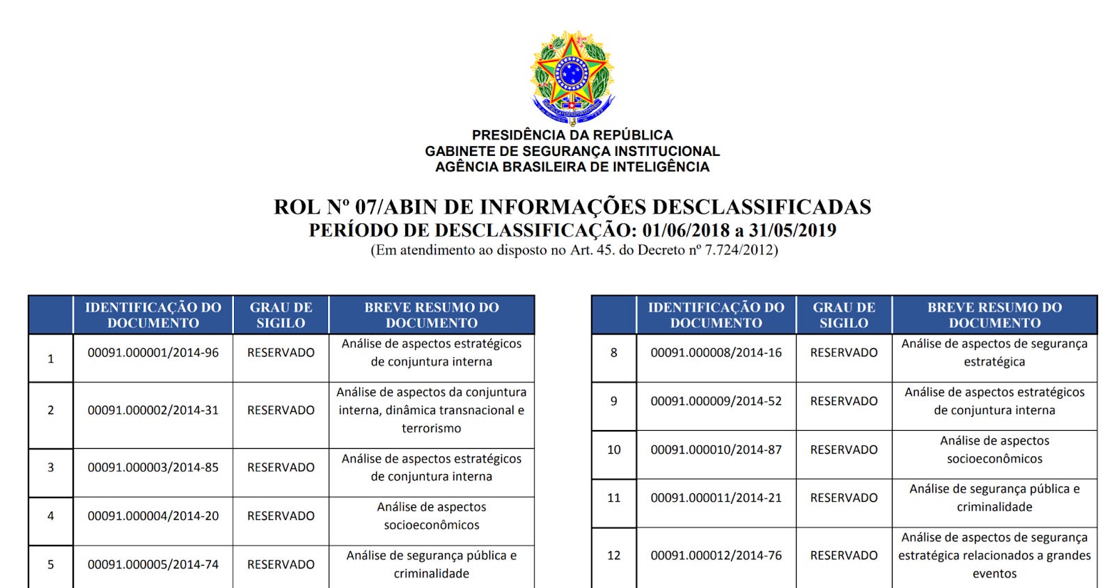 Todos os anos os órgãos públicos são obrigados a divulgar uma lista com o número de cada um desses documentos desclassificados, mas não há obrigação legal nenhuma de divulgar os documentos em si, que podem estar até mesmo em arquivos físicos, sem digitalizar. A lista é chamada de rol de informações desclassificadas (veja aqui um exemplo, da Abin).