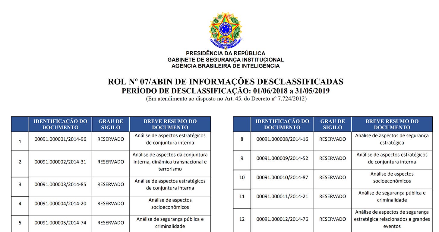 Convidamos todos os inscritos nesta newsletter a registrar pedidos de informação ao Gabinete de Segurança Institucional da Presidência da República (GSI-PR) e pedir acesso a documentos desclassificados, tanto do GSI quanto da Abin. A lista completa de documentos desclassificados pode ser acessada aqui. Vamos mostrar ao governo que existe interesse público nesses documentos e que a sociedade civil está atenta!