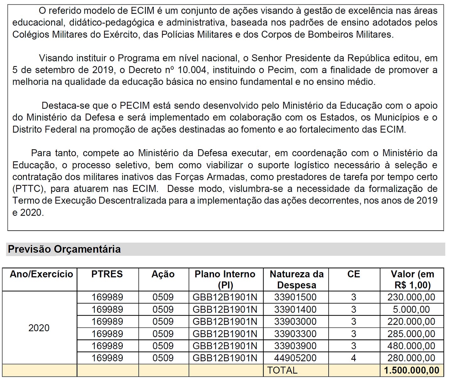 Seleção de militares para escolas cívico-militares vai custar R$ 1,5 milhão (informação obtida com o SEI do Ministério da Defesa)