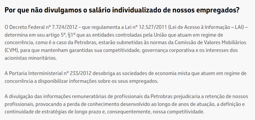 Para negar as obrigações de transparência, as estatais costumam alegar que isso prejudicaria a capacidade de concorrência com empresas privadas ou, no caso de empresas de economia mista cotadas na Bolsa de Valores, como Petrobras e Banco do Brasil, estariam sujeitas a seguir regras da Comissão de Valores Mobiliários (CVM), que, na verdade, não disciplina esse tipo de assunto.