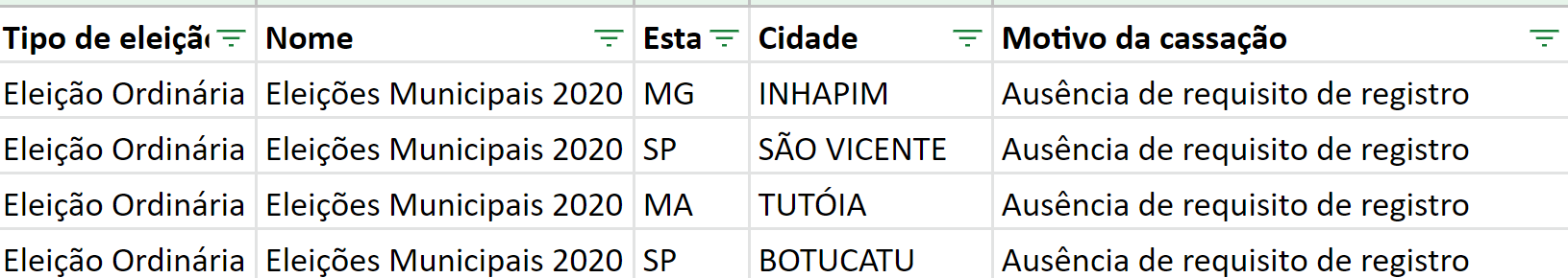 Para facilitar a produção de trabalhos em qualquer município e estado, a Fiquem Sabendo baixou os dados do Repositório de Dados Eleitorais do Tribunal Superior Eleitoral (veja aqui a tabela Motivo de Cassação.