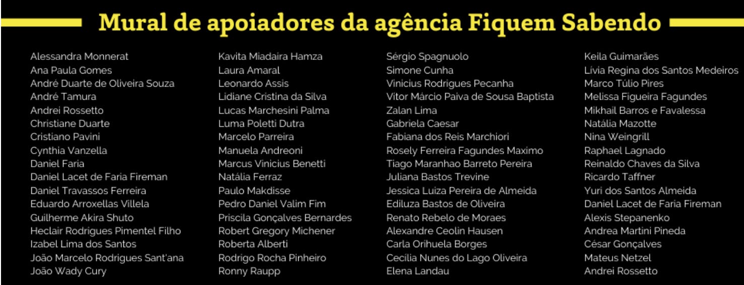 Estamos quaaaase chegando aos 60% da meta! E nossos apoiadores receberam as primeiras recompensas na sexta-feira (não recebeu? avisa a gente aqui). Obrigada a todos que acreditam na nossa equipe e nos apoiam nessa jornada pela defesa e ampliação transparência pública no Brasil. Veja quem faz a Fiquem Sabendo acontecer: