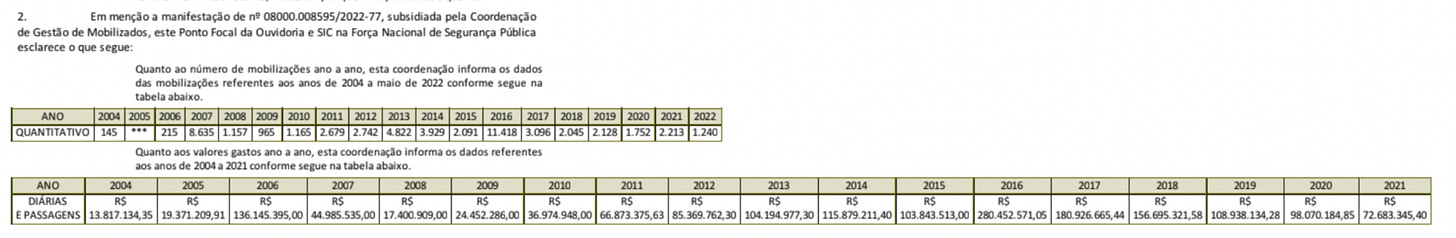 Número de operações da Força Nacional tem quedaNossa equipe obteve, por meio da LAI, planilha com todas as operações da Força Nacional de Segurança Pública desde 2004, com os custos por ano e número de operações. Reportagem no Estadão mostrou que só seis agentes atuavam no Vale do Javari. Veja os principais números, que apontam para uma queda nos gastos com operações: