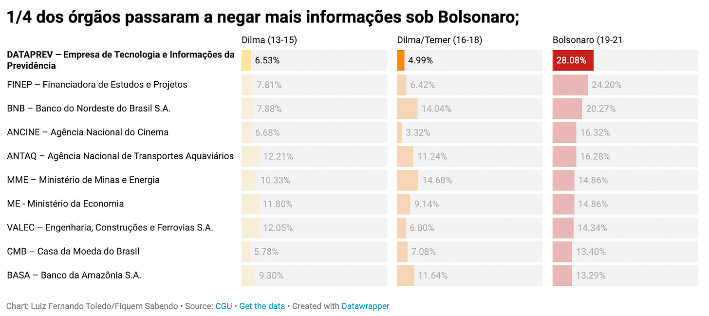Apesar de ter havido uma melhora na média geral, um quarto dos órgãos federais que receberam mais de 1.000 pedidos desde 2013 registrou recorde de negativas no governo Bolsonaro. Veja os dez com mais negativas, com destaque para o Dataprev, que passou a negar praticamente um terço das solicitações.