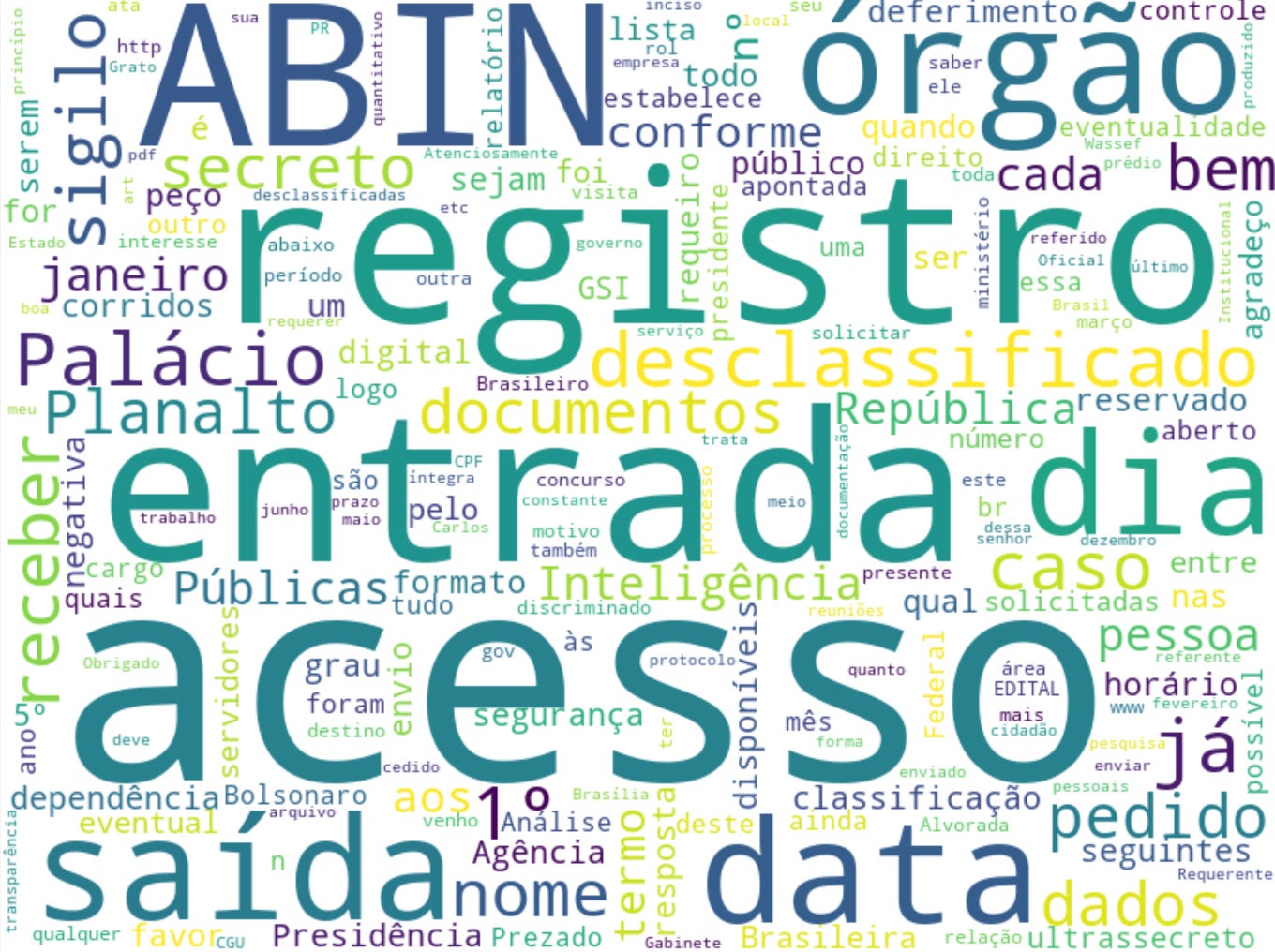 Coletamos o texto dos pedidos negados pelo GSI a partir desta base da Controladoria-Geral da União. Os dados mostram que as palavras mais usadas estão ligadas justamente aos registros de entrada e saída no Palácio.