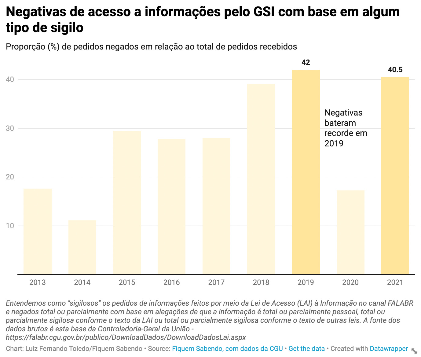 Uma análise de nossa equipe nos microdados dos pedidos mostra que o Gabinete de Segurança Institucional da Presidência da República (GSI-PR), órgão que controla os registros de entrada e saída do Palácio do Planalto, como o dos pastores, bateu recorde de pedidos de informação negados com base em algum tipo desses sigilos no governo Bolsonaro.