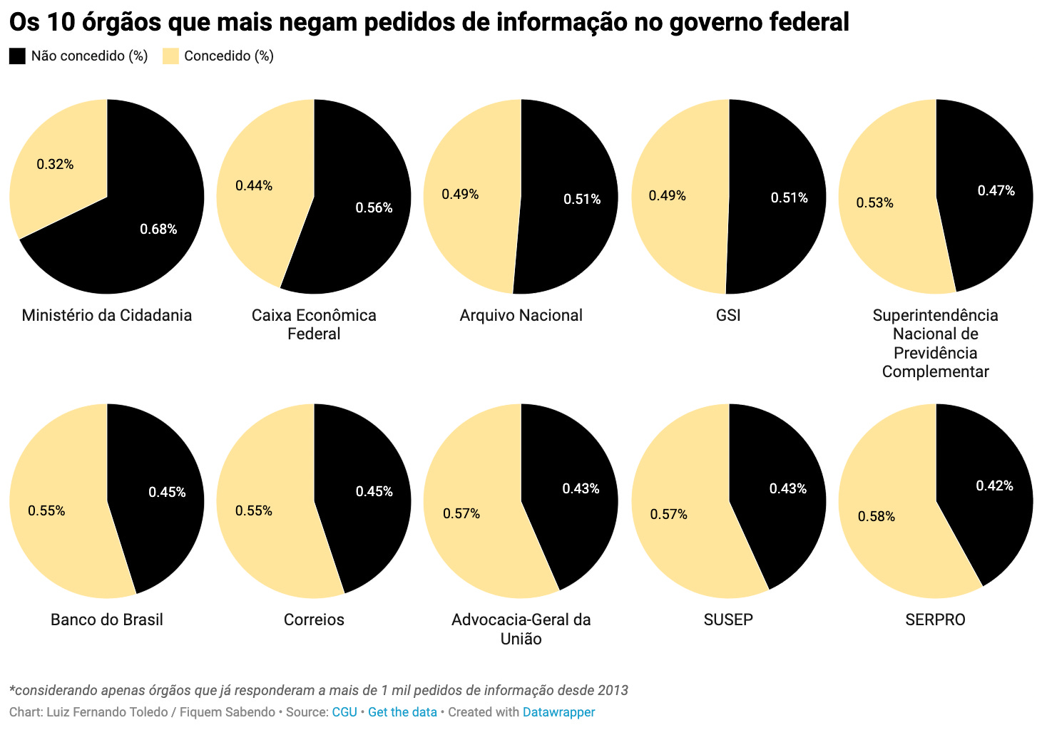 Apesar do aumento, os dados mostram que o GSI nunca foi um órgão exatamente transparente, já que metade dos pedidos que chegam lá não tiveram acesso concedido desde que a LAI foi criada. Outros órgãos têm comportamento parecido. Veja os dez que mais deixam de conceder pedidos (independentemente do motivo), proporcionalmente ao total de recebidos. Consideramos somente órgãos que já receberam mais de 1.000 solicitações desde 2013 para evitar distorções: