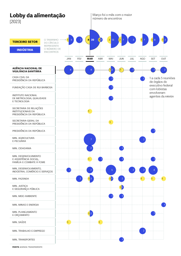 Durante o período de discussão da Reforma Tributária, entre janeiro e outubro de 2023, dados da plataforma Agenda Transparente, desenvolvida pela agência Fiquem Sabendo, revelaram que autoridades do alto escalão do Executivo federal receberam lobistas da indústria de alimentos, bebidas e supermercados em agendas oficiais quase cinco vezes mais do que representantes de associações da sociedade civil organizada ligadas ao setor: foram 69 registros de agendas com lobistas frente a 14 com integrantes da coalizão Aliança pela Alimentação Adequada e Saudável, integrada pelo Instituto Brasileiro de Defesa do Consumidor (Idec), ACT Promoção da Saúde, Associação Brasileira de Saúde Coletiva (Abrasco) e Asbran (Associação Brasileira de Nutricionistas). Houve ao menos 16 tentativas de reuniões da Aliança não atendidas pelo governo.
