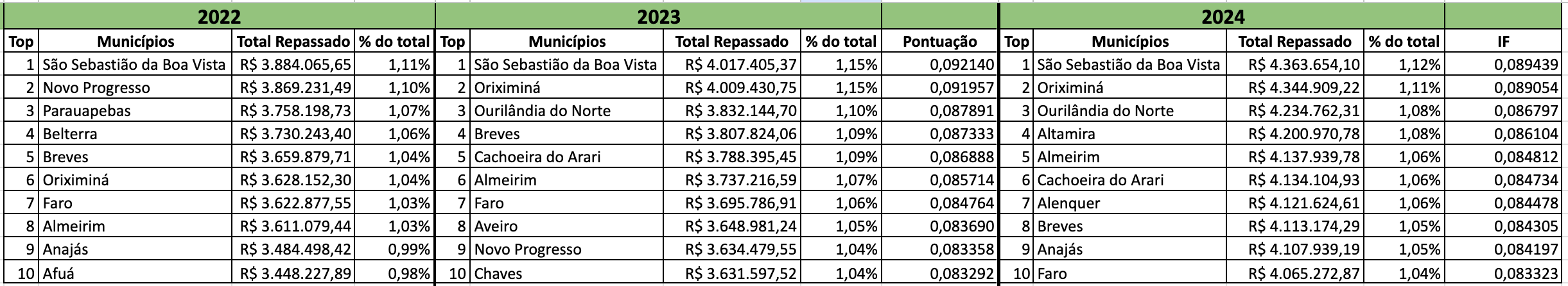 Nas tabelas, apresentamos o ranking dos municípios que mais receberam recursos nos últimos três anos. A análise da pontuação desses municípios no cálculo que define o valor repassado evidencia duas forças que determinam as melhores posições.