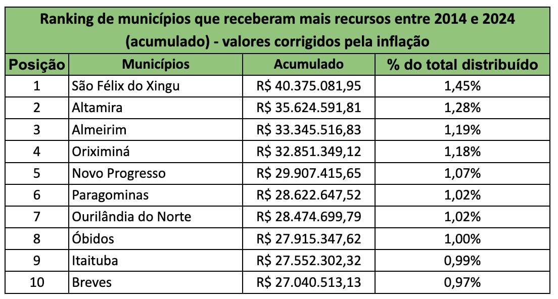 Outro ponto importante é o descompasso entre os municípios que mais receberam recursos no acumulado 2014–2024 e os que aparecem no topo do ranking recente. Fora Ourilândia do Norte, não há coincidência entre as duas listas.