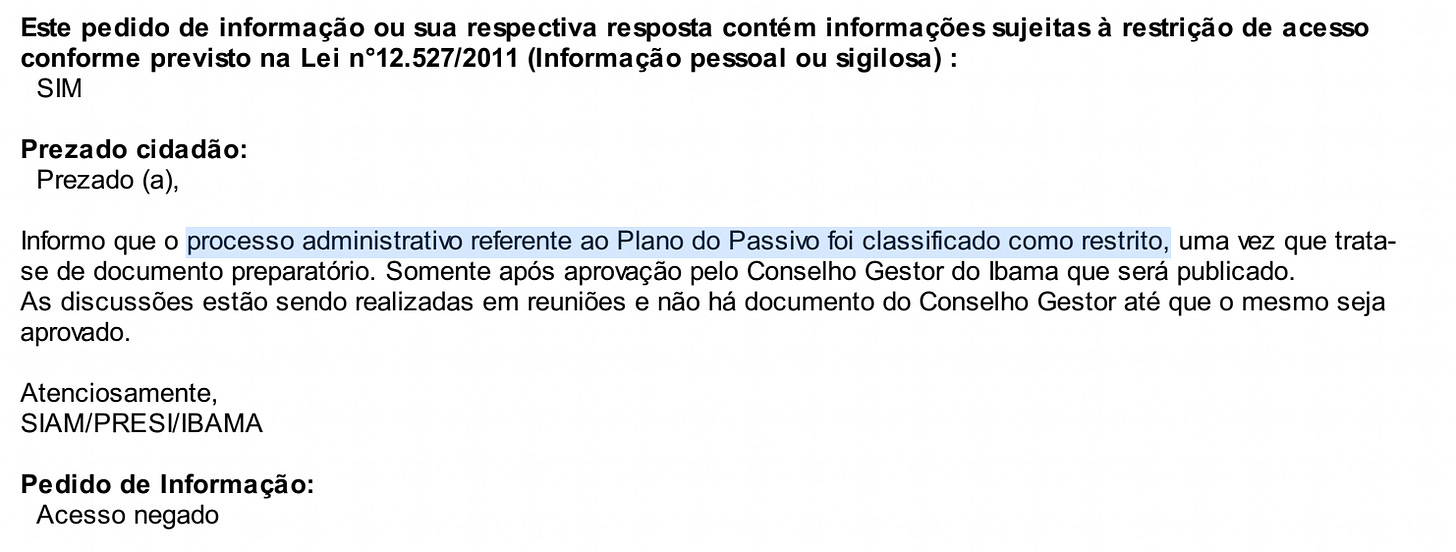 Depois de recebermos a informação e pedirmos mais esclarecimentos, o Ibama colocou todos os documentos em sigilo e passou a dizer que os dados ainda são preparatórios.