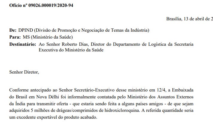 Documento inédito revela que o governo brasileiro recebeu oferta para comprar cloroquina pronta diretamente da Índia