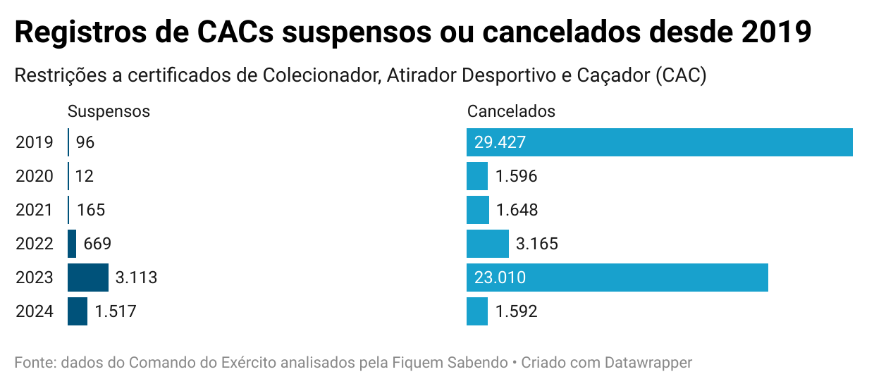 O documento enviado pelo Exército indica que essa mudança de diretriz teve efeito. Entre janeiro de 2019 e abril de 2024, 60.438 certificados foram cancelados – 40,7% deles somente nos primeiros 16 meses de governo Lula (24.602 registros).