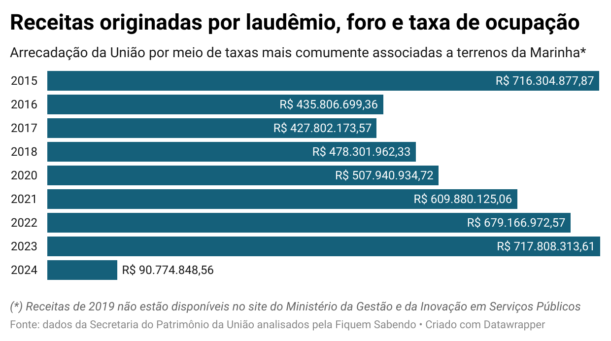 A arrecadação da União com esses terrenos foi de mais de R$ 4,6 bilhões entre 2015 e os primeiros meses de 2024 com três taxas relacionadas à utilização e transferência das áreas: taxa de ocupação, foro e laudêmio.