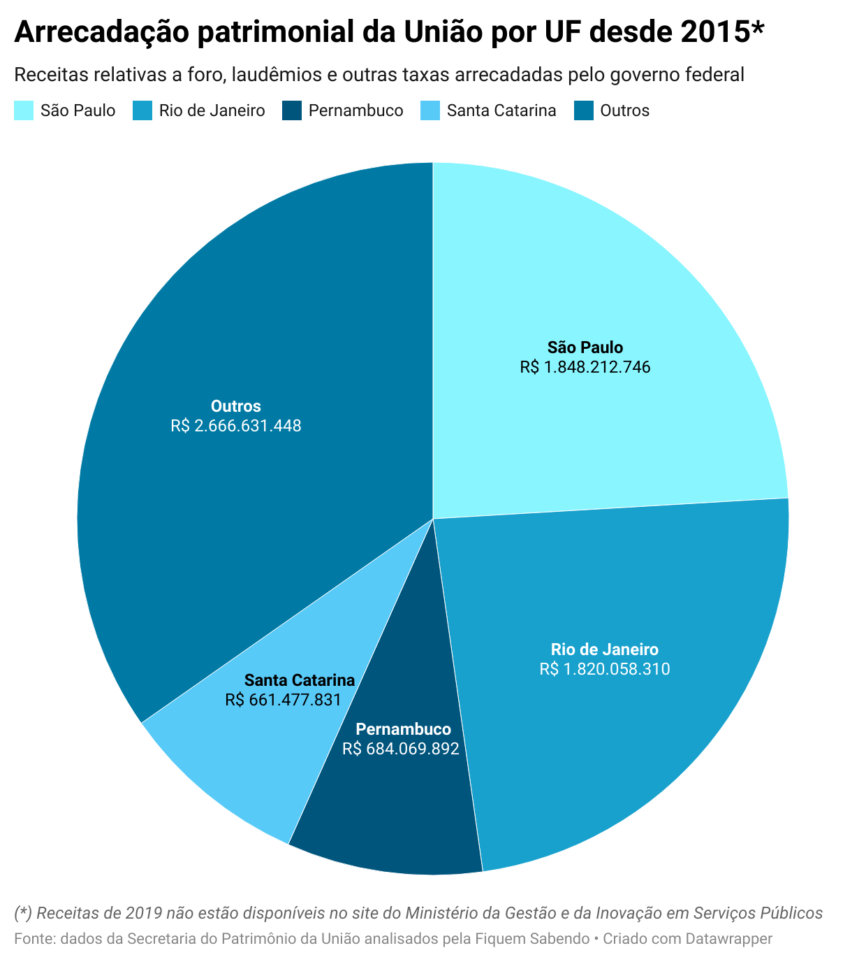 O levantamento da FS indica ainda que os estados do Rio de Janeiro e São Paulo respondem por 47,7% da arrecadação patrimonial da União entre 2015 e 2024, somadas todas as taxas (laudêmio, taxa de ocupação e foro, como aluguéis, permissões e cessões de uso, arrendamentos e alienações).