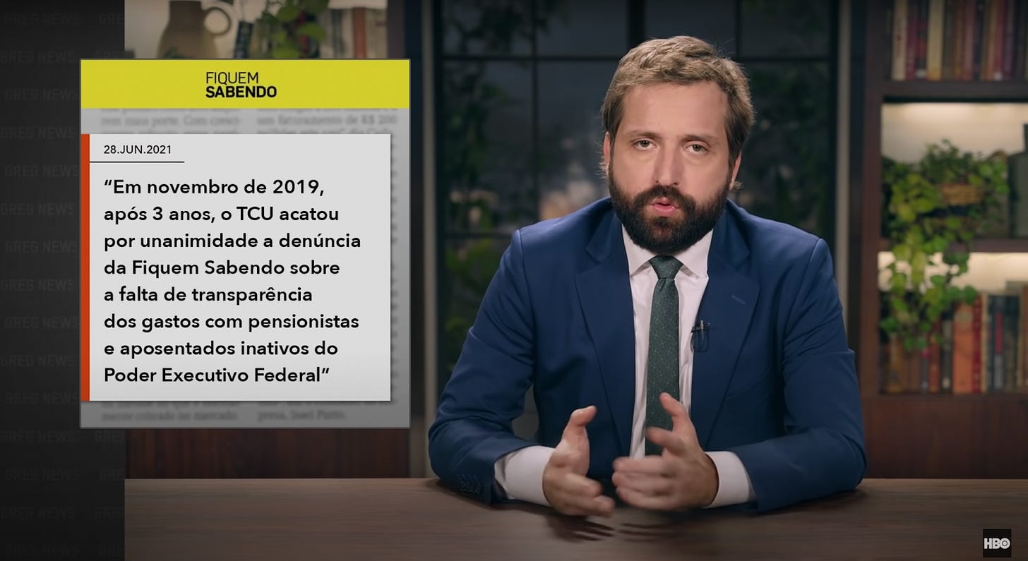Na HBO, no episódio do GregNews desta semana, Gregório Duvivier cita a batalha travada pela Fiquem Sabendo para liberar as pensões pagas a parentes de militares: