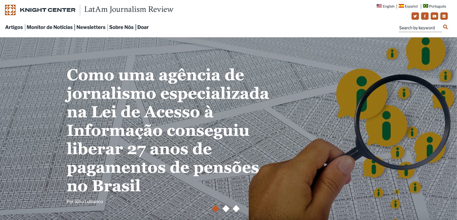 “Como uma agência de jornalismo especializada na Lei de Acesso à Informação conseguiu liberar 27 anos de pagamentos de pensões no Brasil” é o título de reportagem publicada na LatAm Journalism Review (LJR) na última semana, com bastidores da batalha da Fiquem Sabendo pela publicação dos dados individualizados dos pensionistas do Executivo Federal. O texto está disponível em português, inglês e espanhol. Leia aqui.