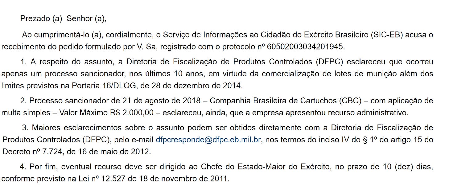Uma portaria do Exército diz que os lotes de munição vendidos devem ter 10 mil unidades - uma forma de padronizar e melhorar o seu rastreamento. Mas desde que a norma foi aprovada, só uma empresa foi sancionada por descumpri-la.