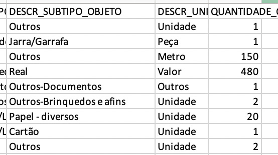 Conseguimos microdados de furtos na cidade de São Paulo com a Secretaria de Segurança Pública (SSP-SP). A vantagem desta planilha em relação às divulgadas no site da pasta é que fica possível ver até o tipo de material furtado e a quantidade, como no exemplo abaixo: