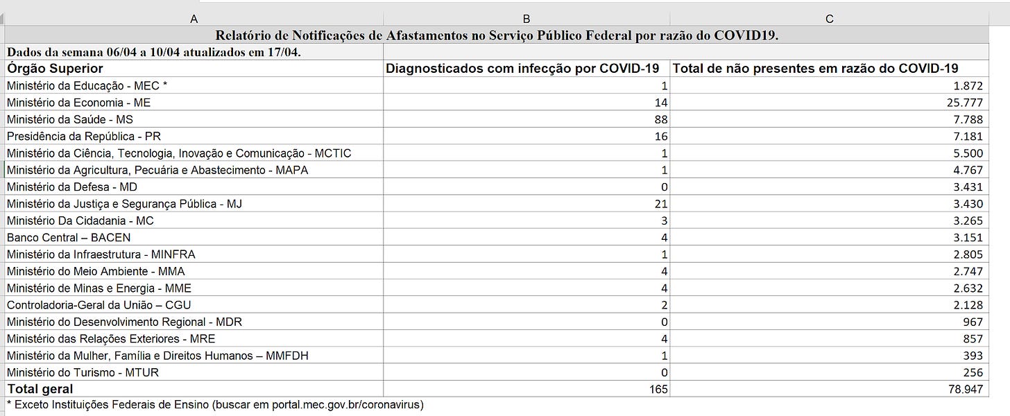 O Ministério da Economia tem realizado um levantamento semanal com dados sobre o número de servidores que estão em home office por causa da crise do coronavírus e também sobre a quantidade de funcionários públicos contaminados.