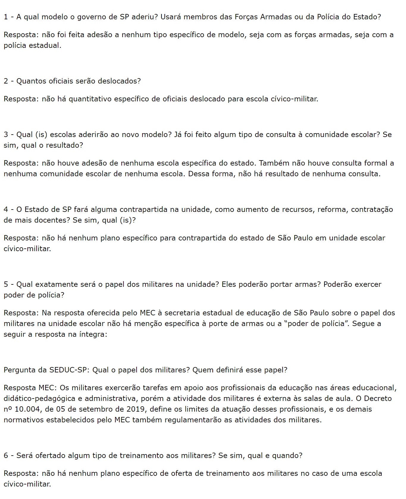 Perguntamos também ao governo de SP sobre qual modelo de escola cívico-militar será usado, se o das Forças Armadas ou da PM, bem como se alguma escola já foi consultada, entre outros questionamentos. A resposta do governo é que praticamente nada foi definido ainda (veja a resposta ao primeiro recurso - mais abaixo da primeira resposta - deste pedido 593981923040, pelo mesmo link que colocamos acima).