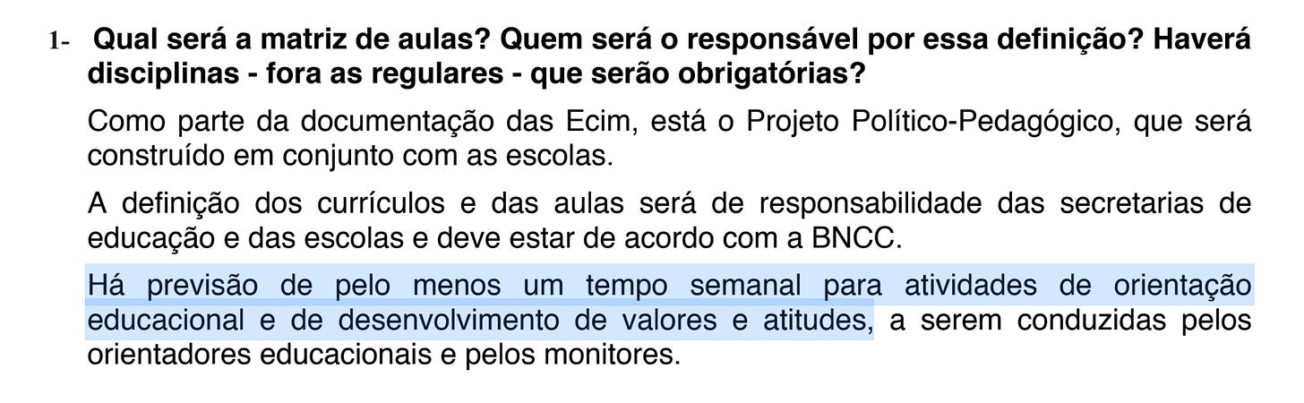 Nós tivemos acesso a um documento enviado pelo Ministério da Educação (MEC) ao governo do Estado de São Paulo sobre a implementação do programa de escolas cívico-militares. Algumas novidades ainda não divulgadas pela imprensa podem ser vistas por lá, como a possibilidade da criação de uma disciplina sobre valores e atitudes (não detalhada). Veja aqui ou cole este protocolo 551791922817 aqui para ver no canal oficial o mesmo documento.