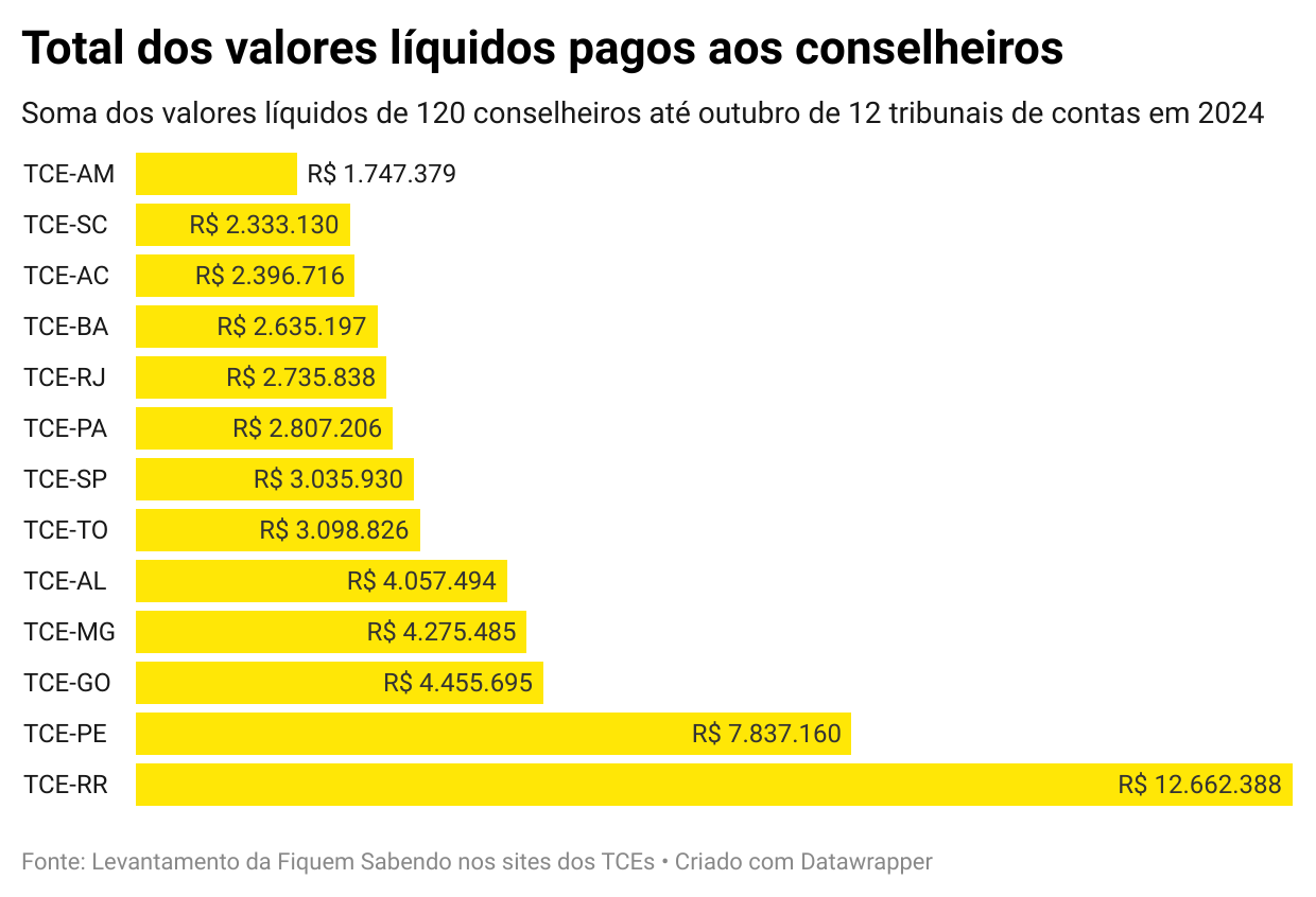 Neste ano, como é possível conferir no arquivo que liberamos, o pagamento líquido total desse grupo de 127 conselheiros chegou a R$ 54 milhões. A cifra foi impulsionada, em boa parte, pelos valores pagos a integrantes dos TCEs de Roraima e Pernambuco, como demonstrado no gráfico abaixo.