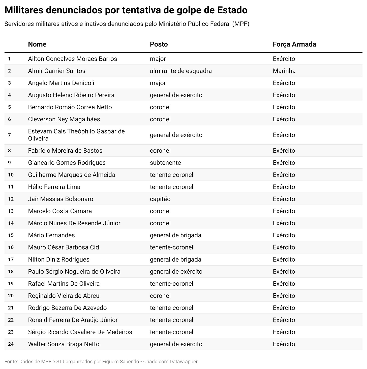 Dos 34 denunciados pelo Ministério Público Federal (MPF) por tentativa de golpe de Estado nos atos de 8 de janeiro de 2023, 24 são militares de carreira ativos ou inativos. Para compreender a trajetória desses servidores públicos – alguns militares integravam o governo Bolsonaro –, a Fiquem Sabendo (FS) solicitou, via Lei de Acesso à Informação (LAI), suas fichas funcionais às respectivas corporações – Exército e Marinha – entre novembro de 2024, logo após o indiciamento pela Polícia Federal, e maio deste ano, depois da apresentação da denúncia.